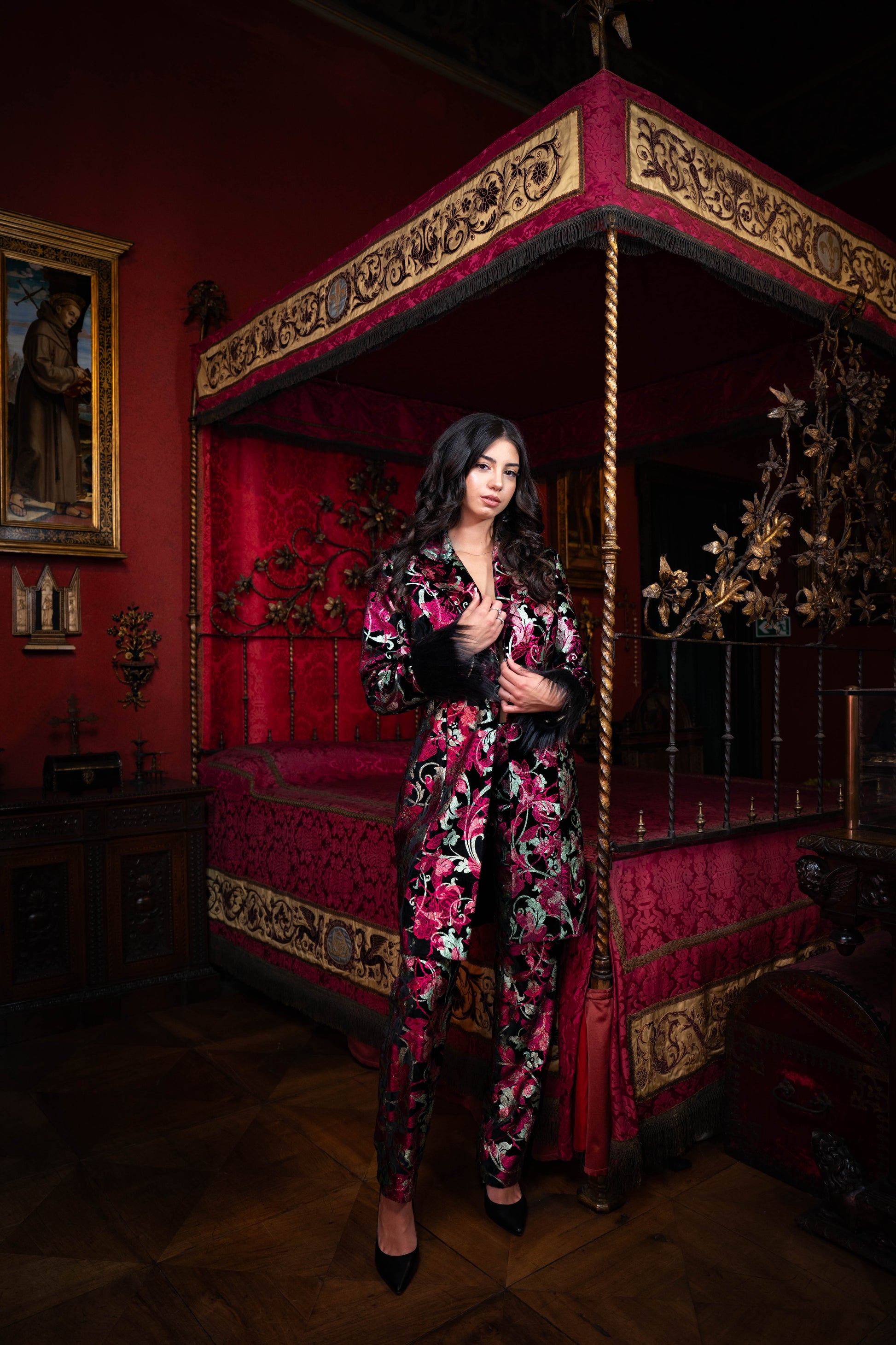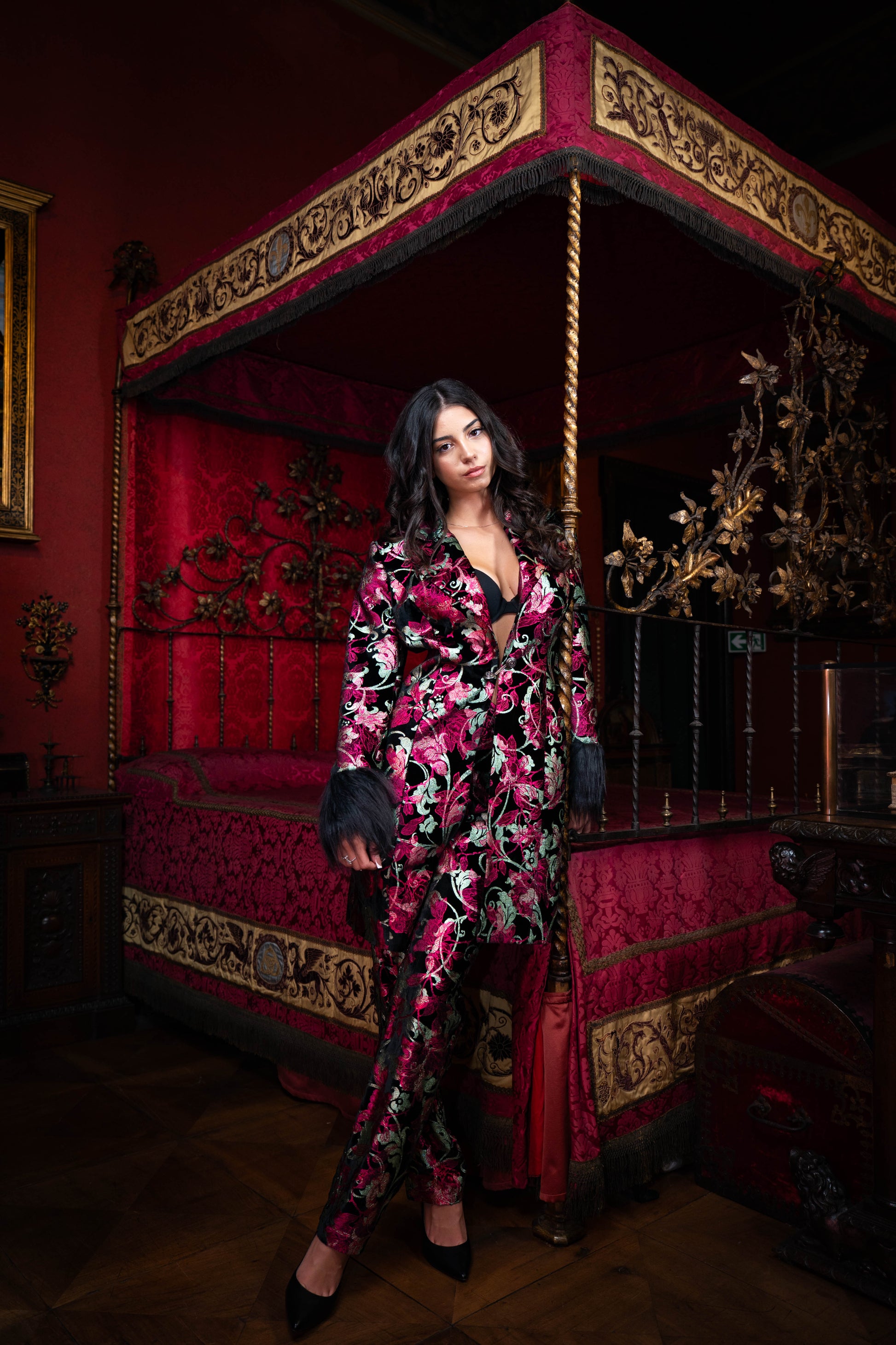 Giacca e Pantalone “Duchessa di Monteleone” – Velluto di seta stampato con dettagli in pelliccia | JLAdore Couture #AfterGattopardo