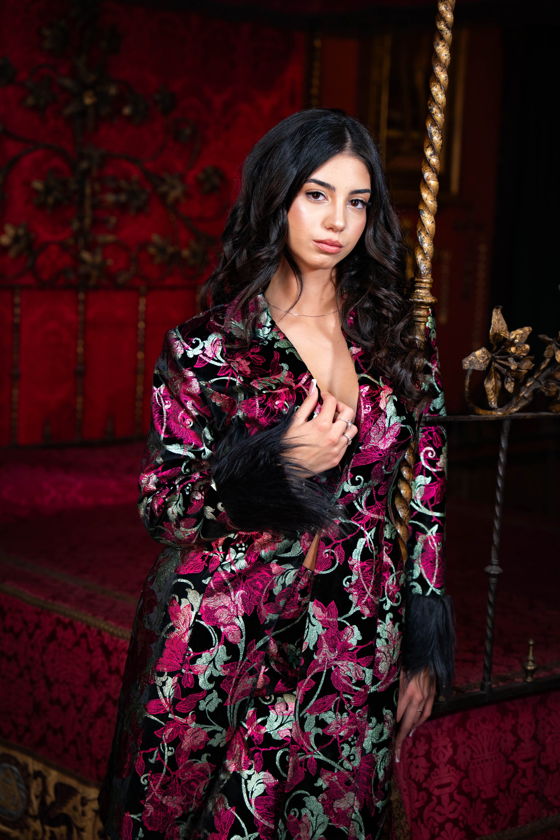 This refined ensemble, composed of a structured jacket and matching pants, is crafted from printed silk velvet, in deep shades of crimson and black, adorned with floral patterns that shimmer with every movement.