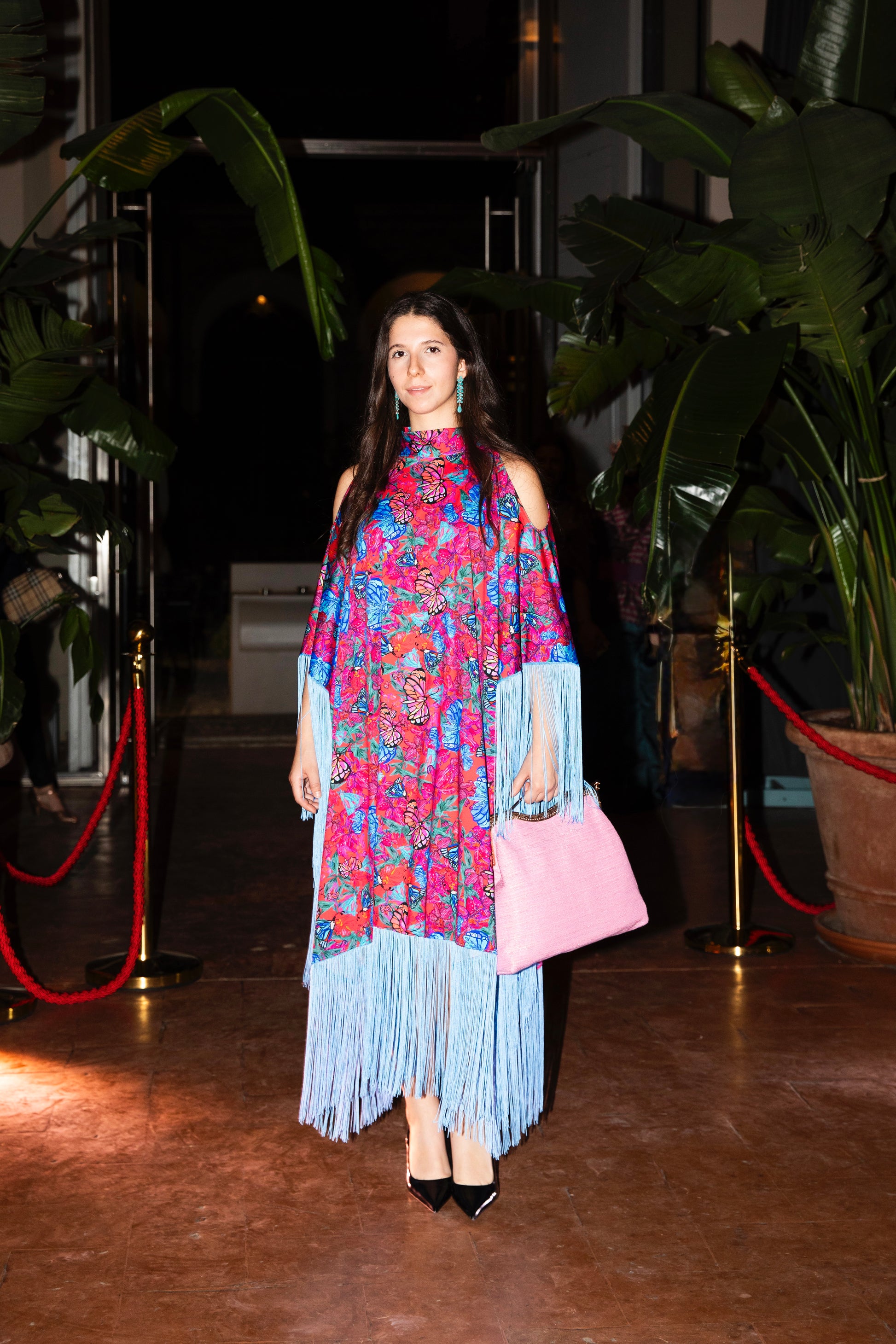 Floral prints and butterflies dance across silk, while sky-blue fringes add movement and mystery.