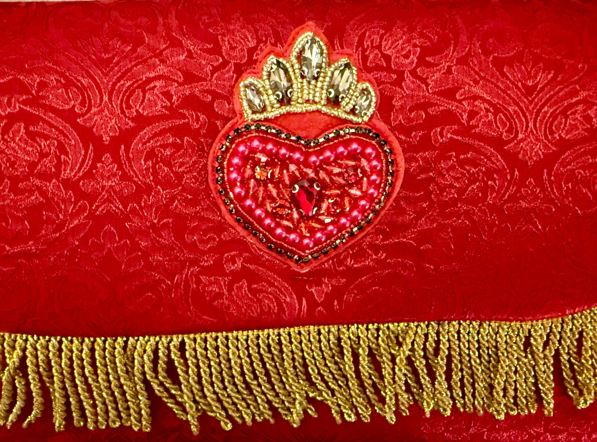 Al centro, un maestoso ricamo gioiello a forma di Cuore Sacro, impreziosito da perle e cristalli, dona un carattere unico e luminoso, trasformando la pochette in un vero pezzo da collezione.